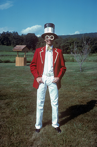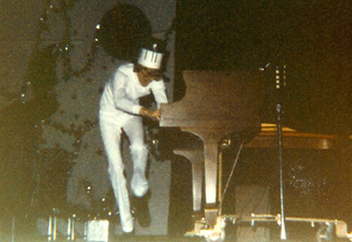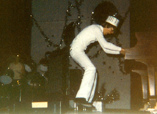 Back during my crazy high school days, our school had an annual talent show competition. Some of us guys decided to put together a "band" and perform a cover of that great Chubby Checker hit, "The Twist". We called ourselves Chubby and the Checkers, in part due to our somewhat portly lead "singer" Eddie Swiger. Highlights of our rendition included the two trombone players turning to face each other, each grabbing the other musician's slide, and proceeding to slide the other trombonist's part while blowing their own!! All while Chris Davenport waddled on his knees underneath playing his baritone horn!! Not to mention Yours Truly dressed up like a crazed Elton John clone, complete with glittered jacket, hat and glasses. Anyway, I would now pay big money for a video of that once-in-a-lifetime event, but alas, hand-held digital camcorders didn't exist back then. However, some kind soul snapped two pictures of me during the performance, so here they are.